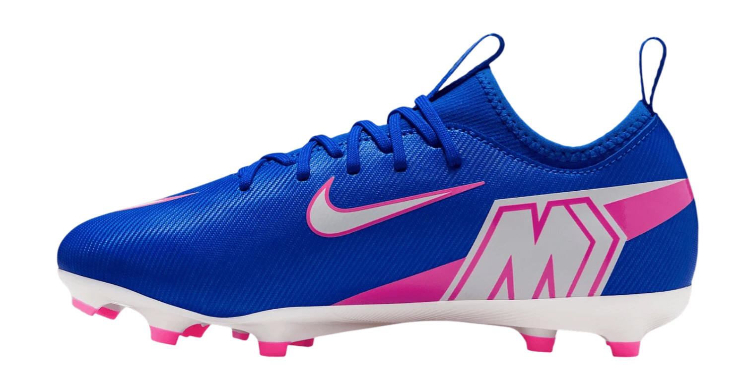 Der flach geschnittene Nike Jr Air Zoom Mercurial Vapor XVI Academy FG/MG Kids ist ein schneller Fußballschuh für Kinder. Die Nike Fußballschuhe mit Hybidsohle sind geeignet für festen Naturrasen, Kunstrasen und Hartplatz. Die Fußballschuhe aus dem Nike Attack Pack rocken mit dem knackigen Konstrast aus Weiß, leuchtendem Racer Blau und knallendem Pink Blast für die Details und Akzente. Ein cooler Coloway, wenn du frische Nike Fußballschuhe für die Rückrunde 2025/2026 suchst.